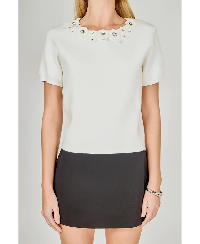 endless rose Women's Floral Detail Short Sleeve Sweater