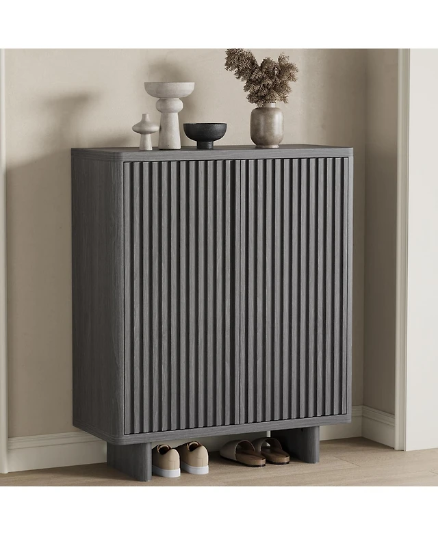 Homfan Fluted Shoe Cabinet with 2 Flip Drawers, Hidden Wooden Adjustable Shelf, Freestanding Storage