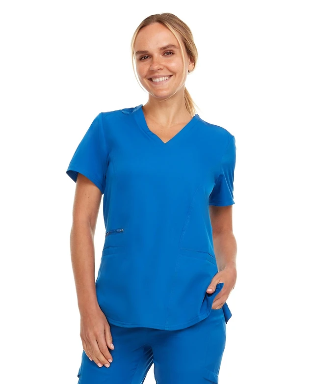 Medichic Women's Scrubs V-Neck Notch Fashion Stretch Scrub Top with Two Pockets, Flex Easy Care Fabric, Bubble Gum, Large