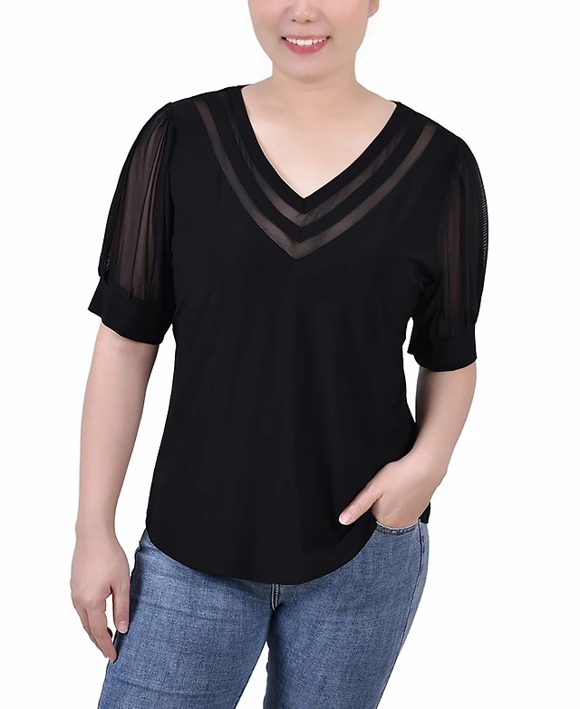 Petite Elbow Sleeve Y-Neck Blouse
