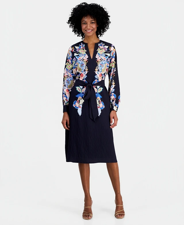 T Tahari Women's Horse-Print Button-Front Long-Sleeve Dress