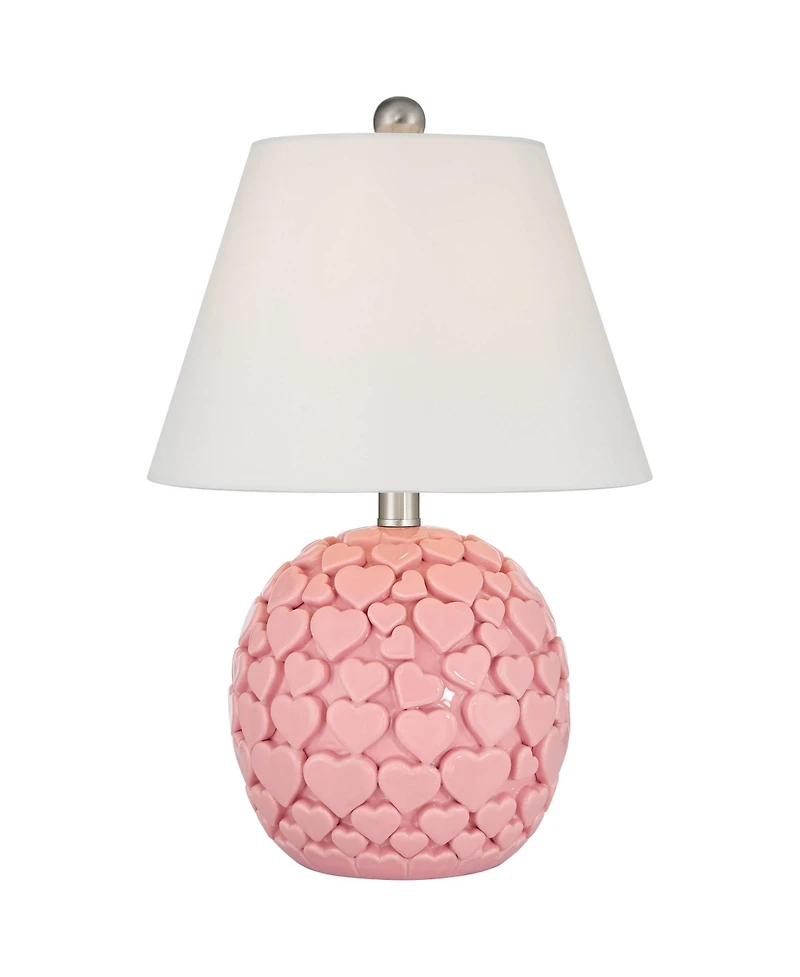 Who ever said overloading on cuteness was a bad thing? The Lovebug table lamp, from the DreamGlow collection of lights for kids by the 360 Lighting brand, is here to showcase love in any space. The rounded pink finish ceramic base dedicates its surface area to raised pink hearts, floating up along the design. Perfect for kids' bedrooms, this piece is complemented by an off-white fabric empire shade, softly directing light downwards.