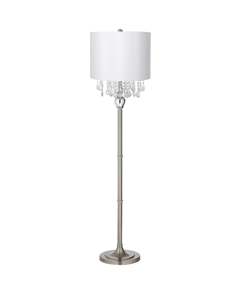 Add eye-catching appeal to your favorite room with our elegant crystal floor lamp. The design features short and long strings of crystal for dramatic sparkle while a chrome finish font on the column adds a jewelry-like touch. A beautiful white fabric hardback drum shade completes the look. Base, column and accents are in a satin steel finish. On-off step switch for easy lighting control.
