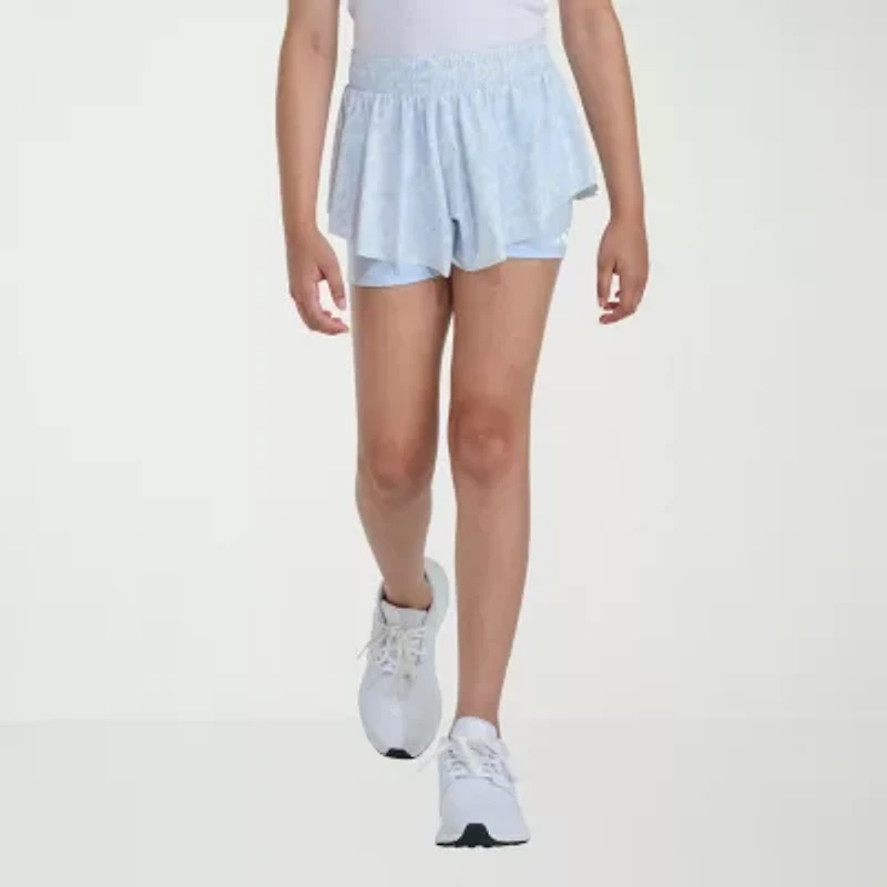 These adidas big girl's pull-on shorts are a stylish addition to her activewear. Made from soft stretch fabric, this mid-rise pair has a ruffled floaty overlay with a subtle pastel print, a pleated front and an elastic waist. Wear them with a tee or tank top.