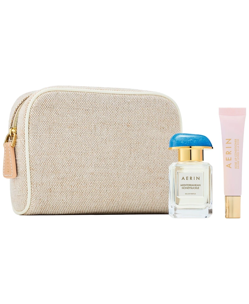 Indulge in the sun-kissed freshness of Aerin's bestselling Mediterranean Honeysuckle eau de parfum, paired with the nourishing rose lip conditioner for a touch of smooth, radiant hydration. Beautifully packaged in a chic two-toned jute cosmetic bag, the trio makes for a great companion for any getaway, offering a fragrant escape and luxurious care in one.