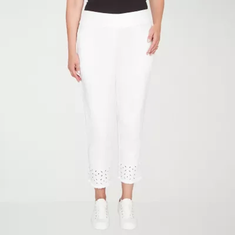 These Alfred Dunner women’s Mykonos pull-on pants offer effortless, summer-ready style. Made from a stretch-cotton blend, this pull-on pair has a comfortable mid-rise waistband with an elastic back and cropped straight legs with embroidered trims. Wear them with a tee or blouse.