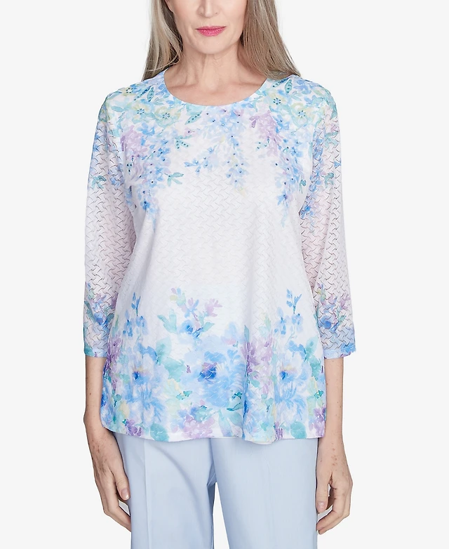 Alfred Dunner Women's St. Thomas Textured Sky Blue Floral Border Crew Neck Top
