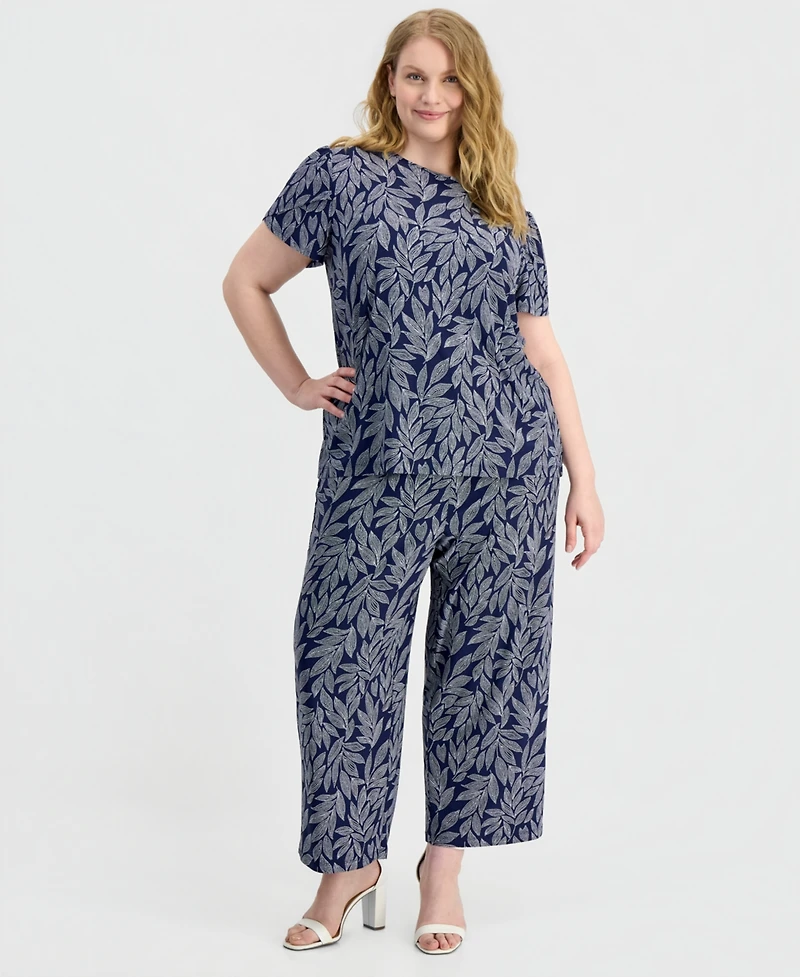 Simply styled and smartly printed, these plus size cropped pull-on pants deliver a fresh wide-leg silhouette from Anne Klein Essentials.
