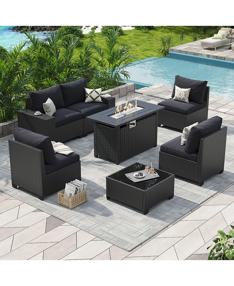 Aoxun 7-Piece Wicker Outdoor Sectional Sofa Set with Black Cushions with 44" Propane Fire Pit Table