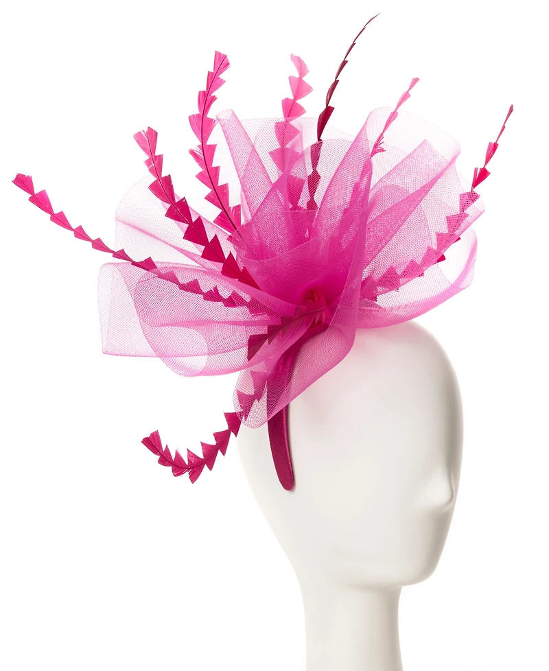 Balance structure and movement in your look with the fascinator from August Hats, pairing layered crinoline with sweeping feather plumes. The bold combination makes a striking choice for weddings, races, and spring celebrations.