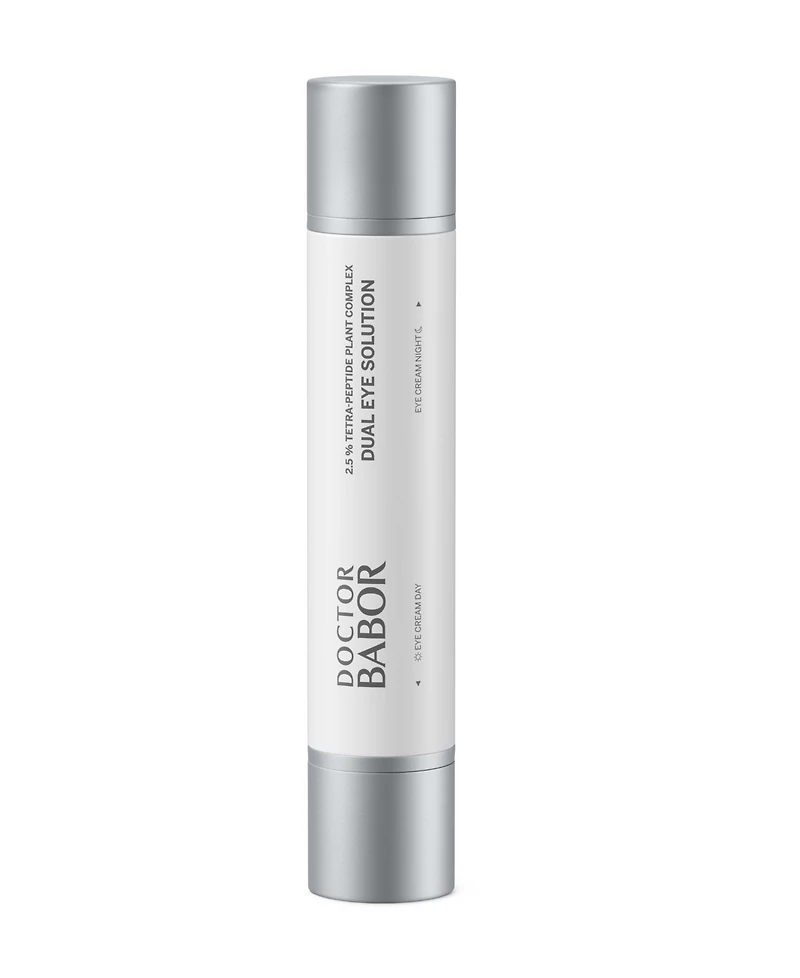 Babor Dual Eye Solution helps create a smoother and more even lower and upper eye area for day and night. Selected high-performance ingredients pamper the sensitive skin around the eyes and provide them with targeted care through two different mechanisms of action. The solutions smooth the eye area thanks to the innovative 2.5% complex of a tetrapeptide and gentian root extract and make dark circles and puffiness appear milder with regular use. In addition, hyaluronic acid and caffeine moisturize the eye area and have a vitalizing effect in day care. The night care promotes a more rested-looking eye area overnight with nourishing and soothing active ingredients such as vitamin F and high-quality oils. Enriched with the Babor-exclusive Biogen extract, the crowning glory of Babor research, the skin's own processes are stimulated and thus the agility of the skin is promoted.