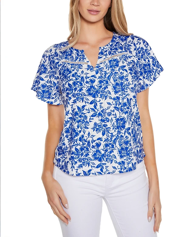 Belldini Women's Floral Printed Eyelet Short Sleeve Knit Top