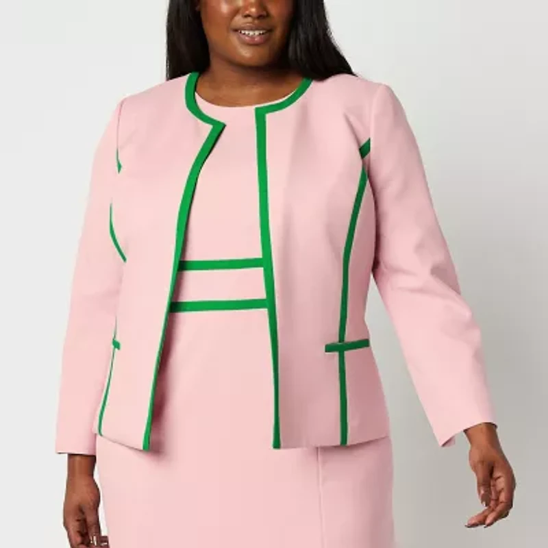This suit jacket from Black Label by Evan-Picone women's plus collection swaps traditional lapels for an elegant crew neckline for a sophisticated update to classic tailoring. Made from a smooth pink fabric with green trim, this blazer has an open front, long sleeves with slits at the cuffs, and side slip pockets. Layer over the coordinating dress and heels or jeans.