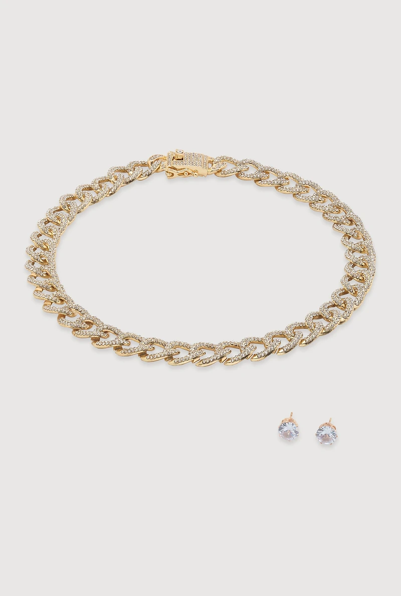 Box Clasp Chain Link Necklace and Stud Earrings