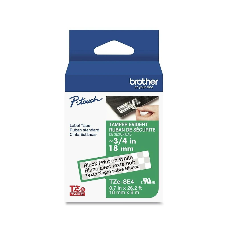 Brother P-Touch TzeSE4 security tape (0.7 in. x 26.2 ft) uses a laminated tape process and telltale adhesive that leaves a checkerboard pattern on both item and tape if removed, clearly indicating tampering. Durable and moisture-resistant, this black-on-white tape is ideal for property security, storage, and general labeling with Brother P-touch labelers using TZ/TZe cartridges.