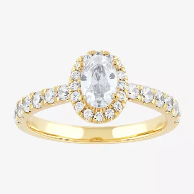 (H-I / Si1-Si2) Womens 1 1/2 CT. T.W. Lab Grown White Diamond 10K Gold Oval Side Stone Halo Engagement Ring