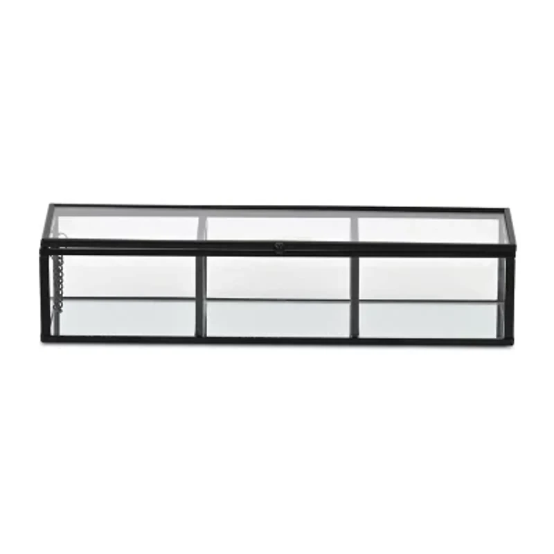 Made with clear glass and a metal frame, this display box features a high-quality, handcrafted feel with elevated detailing. With clean lines, a rectangular silhouette, and three separated compartments, it blends minimalist charm with practical storage. At 10.625 inches long, it offers ample storage while fitting easily on shelves, vanities, or desktops in smaller spaces. Choose between matte black for a modern edge or gleaming gold for a refined, upscale touch. Ideal for storing jewelry, makeup, or desk accessories, this stylish piece enhances living rooms, bedrooms, or offices.