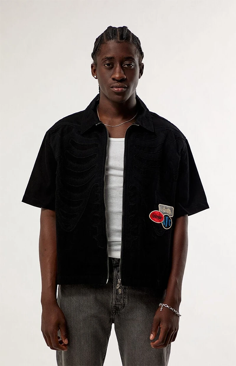 The Dealer Vince Zip Up Short Sleeve Shirt from Civil is a bold, street-ready piece built for effortless style. Crafted from rigid fabric, it features a collar, full double zipper front, short sleeves, a single chest pocket with Civil embroidery, tonal ribcage appliqué on the front, and a relaxed fit.
