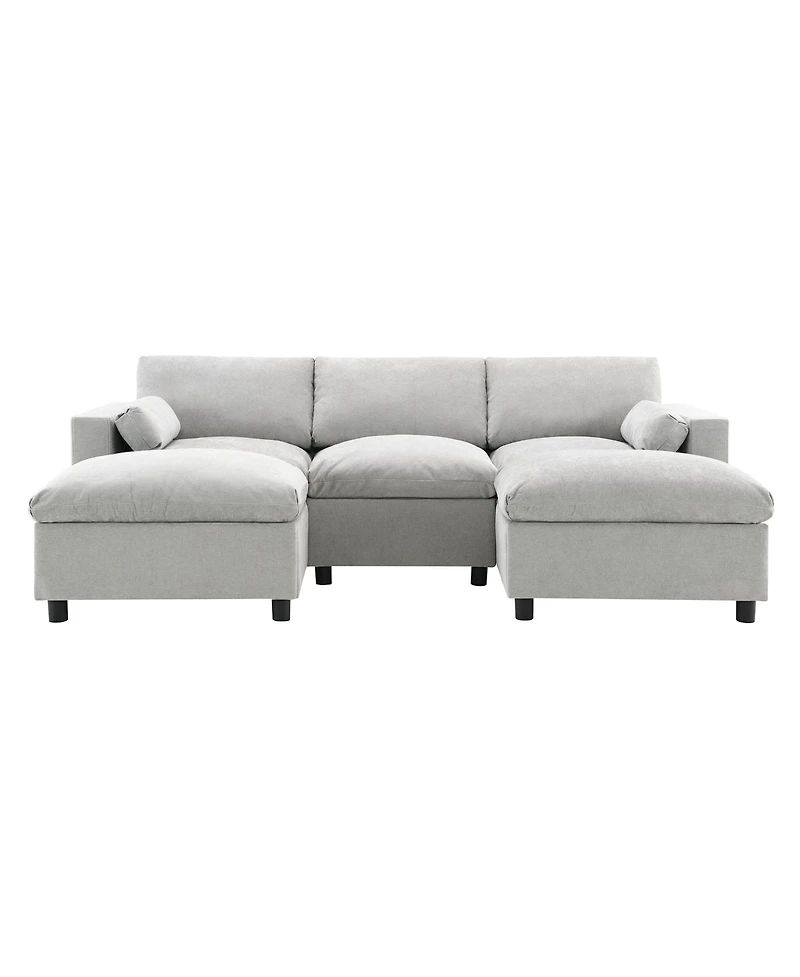 Enjoy smart style and comfort with this chenille five-seat sofa featuring dual side storage bags, two movable ottomans for flexible seating, and plush throw pillows. Compact yet spacious, it fits perfectly in any room, while its sturdy wood frame and durable feet ensure long-lasting use.