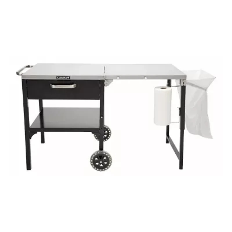 Take your outdoor cooking setup to the next level with the Cuisinart prep 'n cook outdoor table & grill stand. This versatile station combines a stainless steel 48" x 24" work surface with dedicated space for both food prep and cooking. One side accommodates most portable grills, griddles, or pizza ovens, while the other provides ample room for cutting, seasoning, and plating. Designed for convenience, it features a hideaway condiment caddy, integrated trash bag holder, and a paper towel rack to keep your workspace organized. When you're done, the prep side folds down for compact storage, and built-in wheels make it easy to roll away.