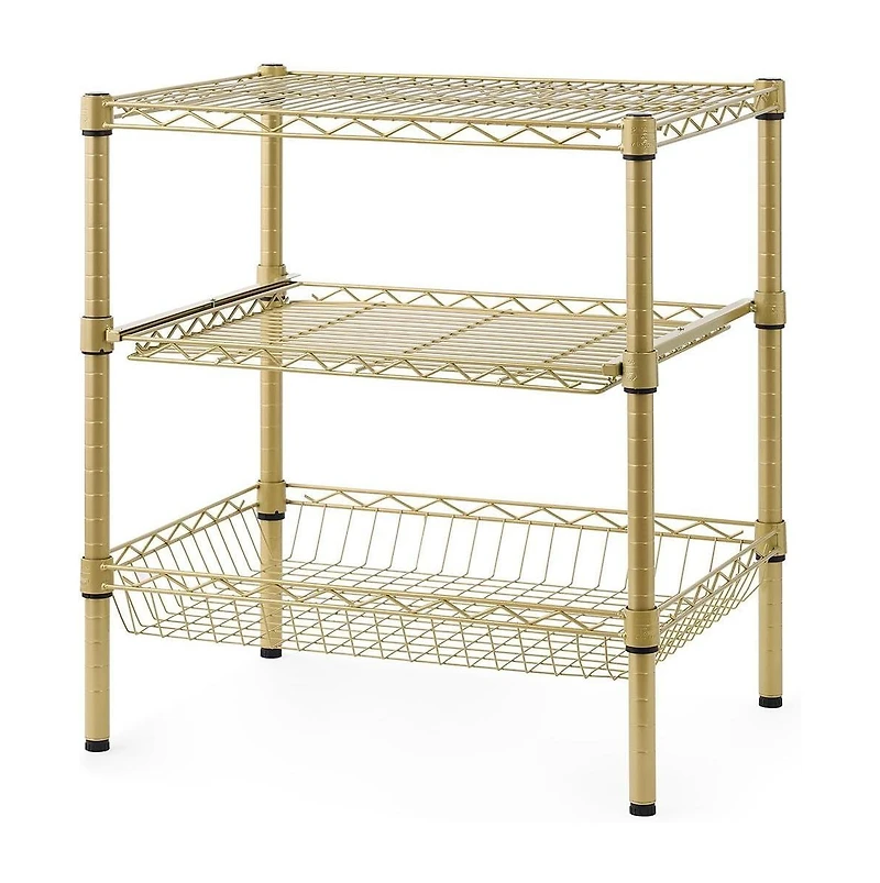 Need extra shelving but short on time? With the Suprima Double Height Fridge Stand is easy to put together, so you don't have to spend hours putting together some sturdy shelving. This gold shelving has three shelves, one for your mini fridge and two more for small appliances, kitchen supplies, and more!