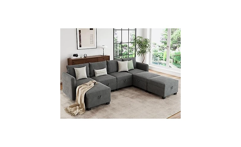 【Hidden Storage Master for Living Room 】 Each seat of this modular sectional sofa has a hidden storage space where it is not only a holy place for children s toys, but also can store blankets and remote control, making your living room neat and tidy. High quality spring loaded quiet hinges offering minimal effort to open and close. Storage Size: 23.2” 23.2“ 7”【Oversized Sleeper】 Not just an U shaped sofa but also an sleeper sofa, The modular sectional couch can meet your different needs and provide your guests with a great sleeping solution. Providing a comfortable sleeping surface for guests or family movie night and maximizing the space in your living room【Customizable to Your Space】 Tailor your seating arrangement to perfection with this modular sleeper sofa, offering infinite configurations to suit your space. With tree versatile modules, including single seat, ottoman, and armrests, the possibilities for customization are endless. This flexibility makes it an ide