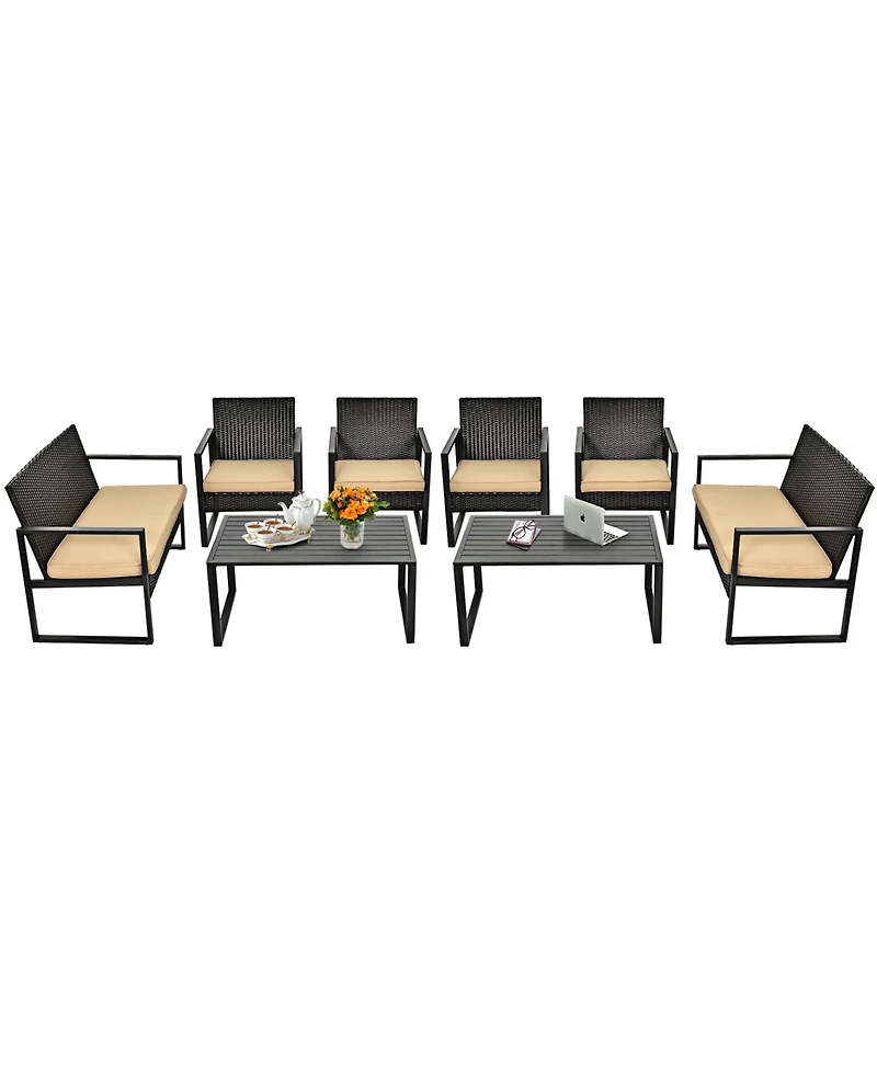 This 8-piece rattan sofa set with concise style is ideal to be placed in your patio or garden. Made of solid steel and tight rattan, the whole frame is sturdy and not easy to crack or deform. All the single chairs and loveseat are equipped with soft and high-resilient cushion for seat. You will get excellent comfort if you sit on the sofa. Besides, bottom feet of the set can be adjusted to fit for uneven ground. Each piece of our set is independent so that they can be rearranged based on your preference. Comes with 2 coffee tables, you can put drinks, snack, magazines and fruits on. Please enjoy your leisure time with your friends or family in your outdoor space.Features:Steel and premium rattan adds sturdiness and durabilitySoft and thick cushions provide you excellent comfortSloping backrest to support your back comfortablyWide armrest in suitable height to rest your arm