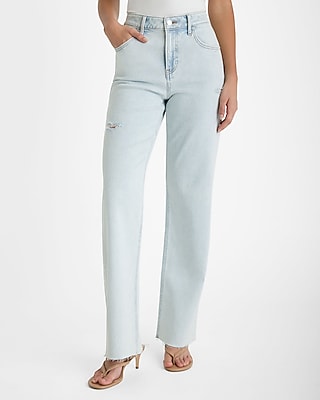 High Waisted Light Wash Ripped Raw Hem Relaxed Straight Jeans