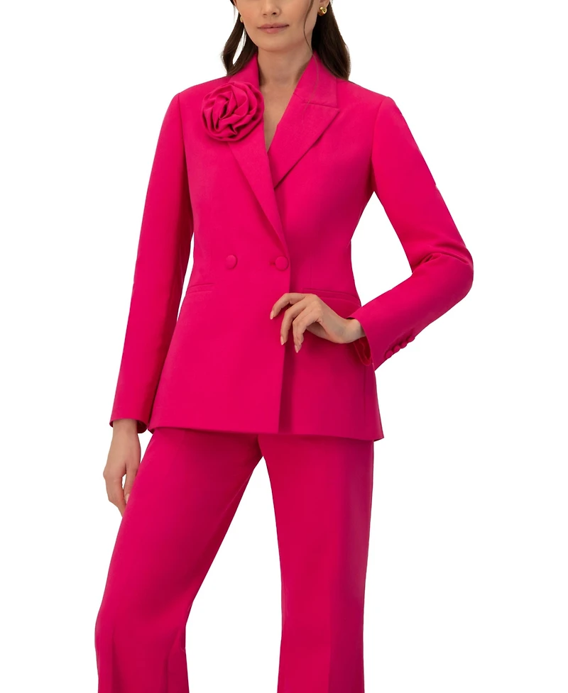 Sleek blazer featuring a double-breasted front and a floral detail on the lapel.