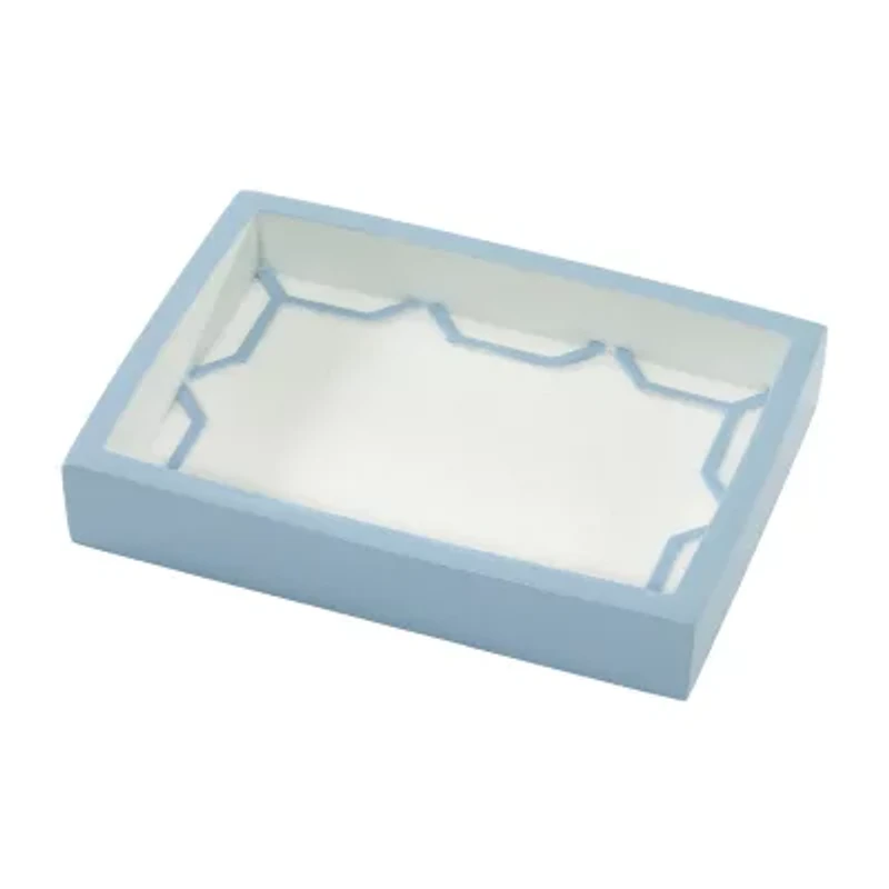 The Izod Trellis Decorative Soap Dish features a rectangular, white body with medium blue trellis details and outside edge for a clean, modern look. Crafted of hand-painted sand resin that gives it a sparkle along with solid feel, easy care and durability. Measures W 4" x L 5.63" x H 1". Other matching accessories are also available. Shop the entire Izod bath collection of shower curtains, towels, rugs and bath accessories.