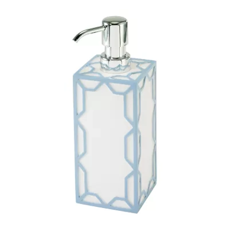 The Izod Trellis Decorative Soap and Lotion Dispenser feature a square, white body with medium blue trellis details for a clean, modern look. Crafted of hand-painted sand resin that gives it a sparkle along with solid feel, easy care and durability. Topped with a shiny silver plastic pump. Measures W 2.83" x L 2.83" x H 8.2". Other matching accessories also available. Shop for the entire Izod bath collection of shower curtains, towels, rugs and bath accessories.
