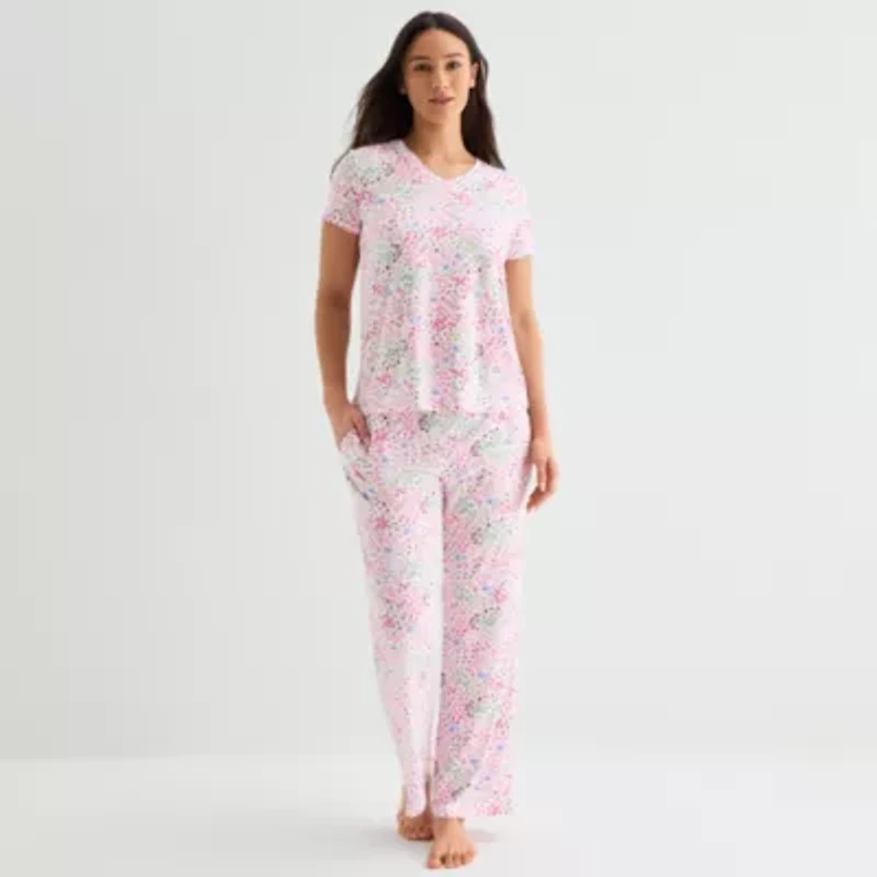 Made from soft stretch-knit, this printed 2-piece women's pajama set by Jaclyn will keep you comfy through all of your sweet dreams. The combo includes a V-neck short-sleeve top and a matching pair of pull-on pants with an elastic-waist and side pockets.