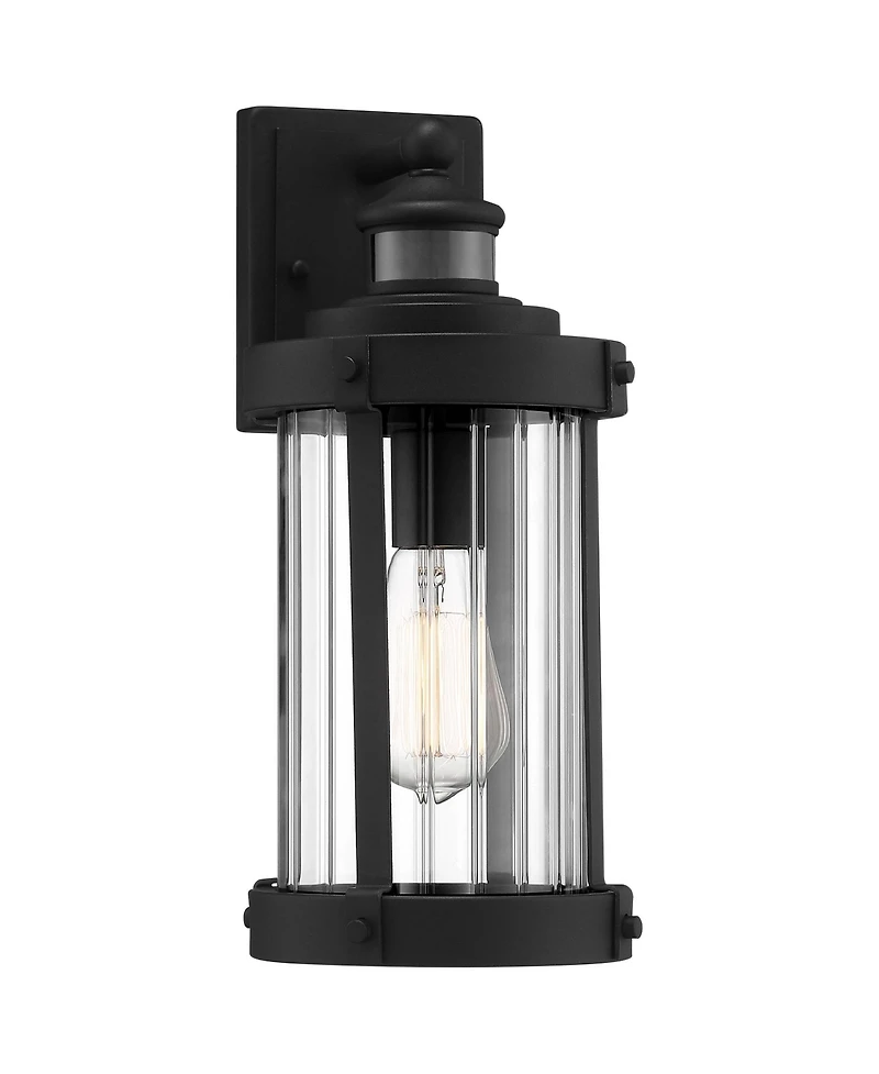 Bring an upscale look to exterior lighting with this chic outdoor wall light. Attention to design detail produces a rich lodge look with industrial flavor. This outdoor wall light features a clear glass shade and a black finish case with metal strips. The design also comes with the Dual Brite two-level lighting feature, which brightens the light output from the light when motion is detected.