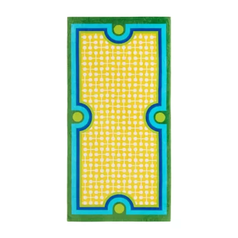 Brighten your beach days with the artful color and comfort of the Jonathan Adler Madrid Jacs Beach Towel, a must-have luxury towel and essential summer accessory. Designed to blend modern style with everyday performance, this oversized beach towel is crafted from 100% premium cotton, delivering exceptional softness, durability, and high absorbency for quick drying after swimming. The vibrant modern geometric pattern adds a refreshing pop of color, while the premium construction reverses from a plush velour front to a highly fast-drying terry loop back. Perfect for the beach, pool, spa, or your next resort getaway, this towel is designed for effortless care - simply machine wash to keep it looking fresh and luxuriously soft all season long. Wrap yourself in modern style and everyday luxury with this must-have seasonal staple from Jonathan Adler.
