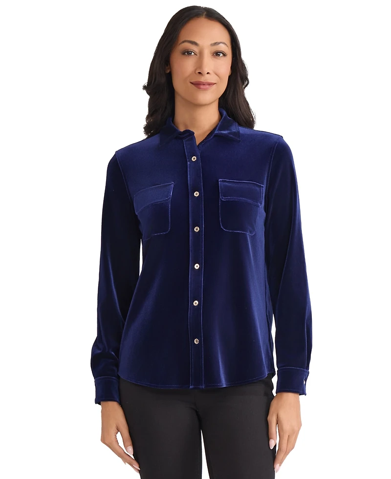 Dazzle everyone with this Jones New York long-sleeve shirt that features convenient front pockets for quick access. Its classic button closure adds an air of sophistication to your ensemble.