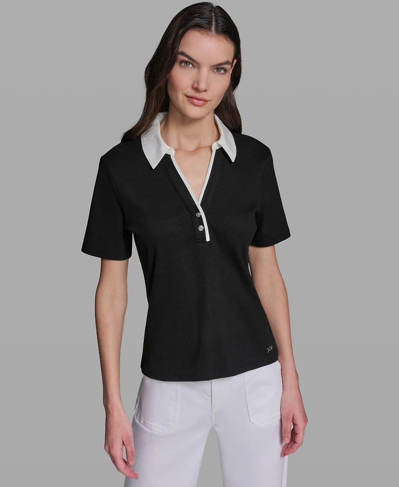 Modern tailoring meets casual charm in this Karl Lagerfeld Paris Johnny collar top, where a structured collared neckline enhances shape with a contemporary edge. Finished with short-sleeves and a pull-on style with four front buttons, it delivers ease of wear with a refined touch.