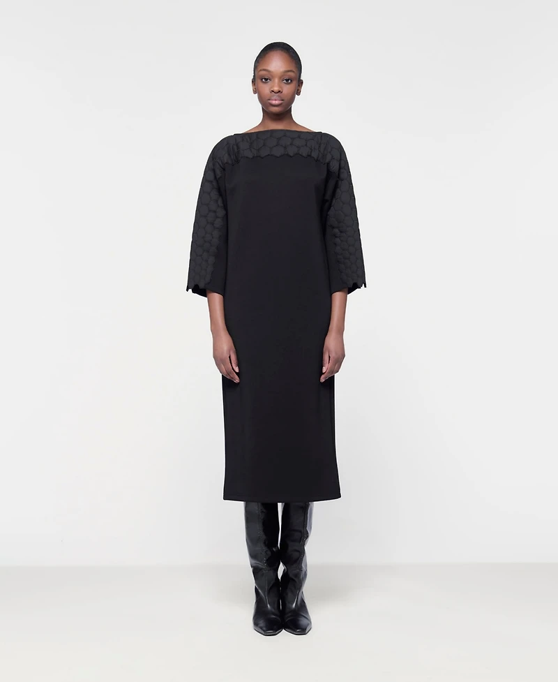 Cold days don t mean dull layers—this Quilted Embroidered Dress adds warmth and texture with scalloped panels on the shoulders and sleeves. Its straight cut, mid-length hem, and back slit keep things comfy and easy to move in. Perfect with boots, flats, or whatever the day brings.