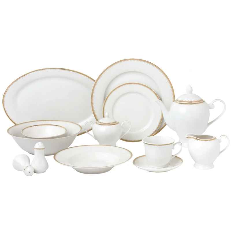 57 Piece Porcelain gold border and white trim Dinnerware set, service for 8 Modern and elegant white accent border surrounded by a brilliant gold trim. Durable porcelain great for everyday use but also fine and elegant enough for special occasions This set comes complete with everything you need to set your table including serving pieces.
