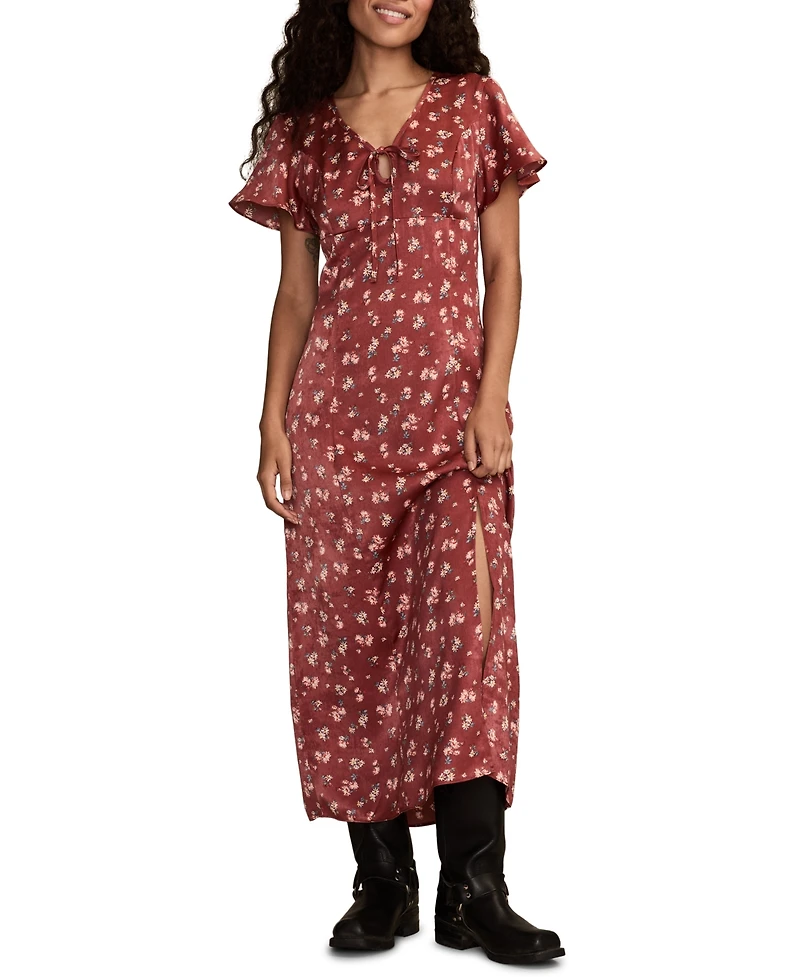 Designed with flutter sleeves and a lace-up back, this Lucky Brand midi dress features a floral print and a smooth faux silk finish. Pull-on styling ensures easy wear for day or night occasions.