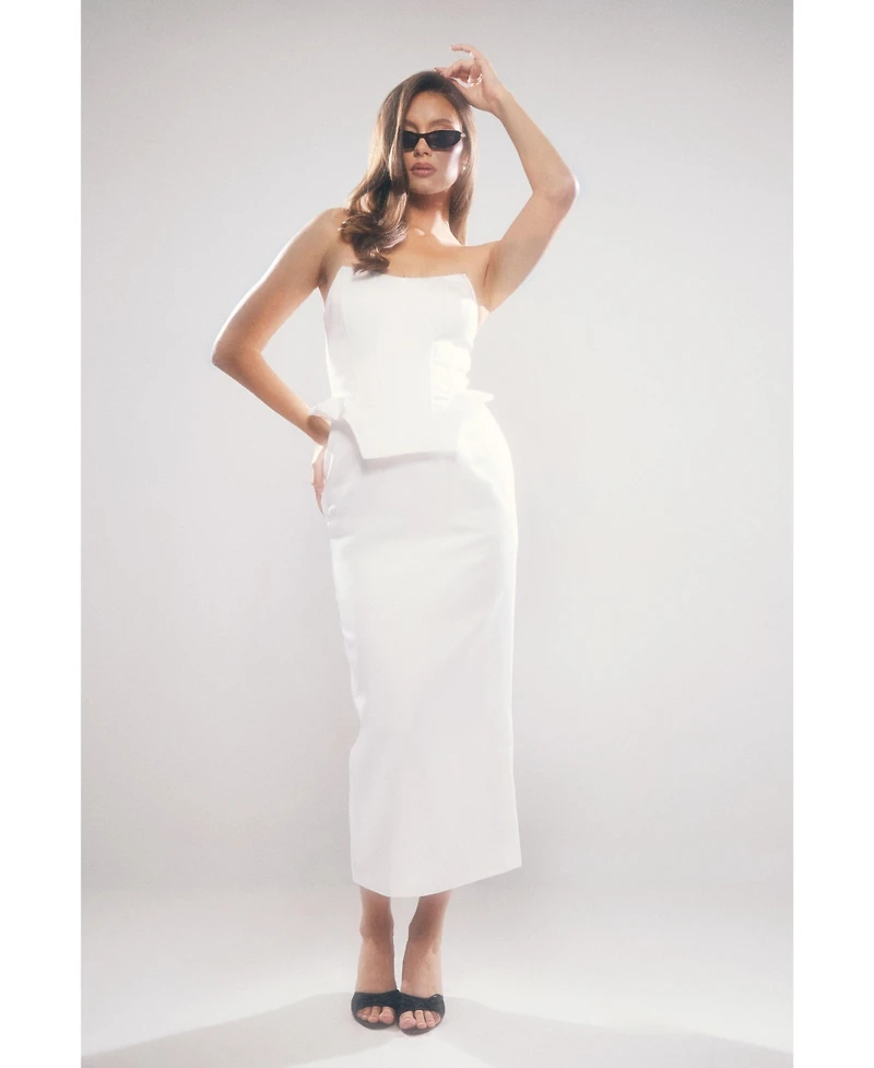 Sculpted corset midaxi, tailored seams and dramatic peplum sculpt the waist for a striking evening silhouette.