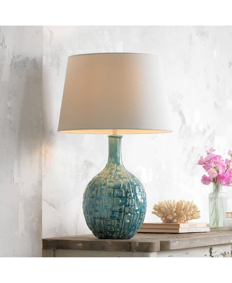 Modern Table Lamp 26" High Teal Glaze Raised Square Ceramic Gourd White Fabric Tapered Drum Shade Decor for Bedroom Living Room House Home Bedside Nig