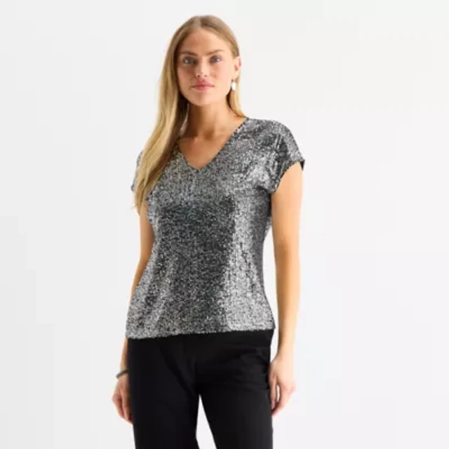 MSK Sequin Womens V Neck Short Sleeve Blouse