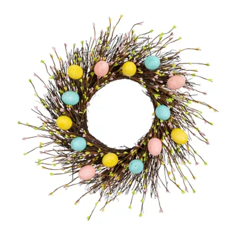 A cute wreath is all you need for the holidays and this 20-in artificial Easter twig wreath delivers just that. Inspired by the whimsical, wonderful season of pastel colors, small egg-shaped ornaments of varying sizes and hues adorn the silhouette, and the unique design will brighten any space. Farmhouse chic and youthful aesthetics, watch as this wreath makes a welcoming statement. Perfect to style your front porch, kid's room and more. Customize and shape the small branches with ornaments for a one-of-a-kind look.