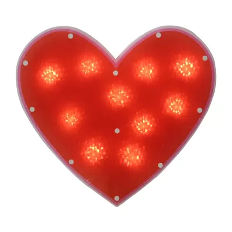 Celebrate Valentine's Day with a touch of warmth and romance. Our captivating window silhouette features a radiant red shimmering heart accented with white lights casting a spellbinding glow that embodies the essence of love. Illuminate your home with this enchanting display and let it be a beacon of affection for all to see. Product Features: Color: clear bulbs / white wire. Number of bulbs: 10. Bulb size: mini. 25" white lead cord. One-sided design. Additional Product Features: If one bulb burns out the rest will stay lit. Fully assembled decoration comes in 1 piece. UL certified and approved for indoor or outdoor use. Contains 1 plug with end connector which allows you to stack multiple lighted items together (not to exceed 210 watts). Comes with replacement bulbs spare fuse and 1 suction cup for hanging. Wire gauge: 22. Dimensions: 12" high x 13" wide. Material(s): plastic/glass bulbs/wire