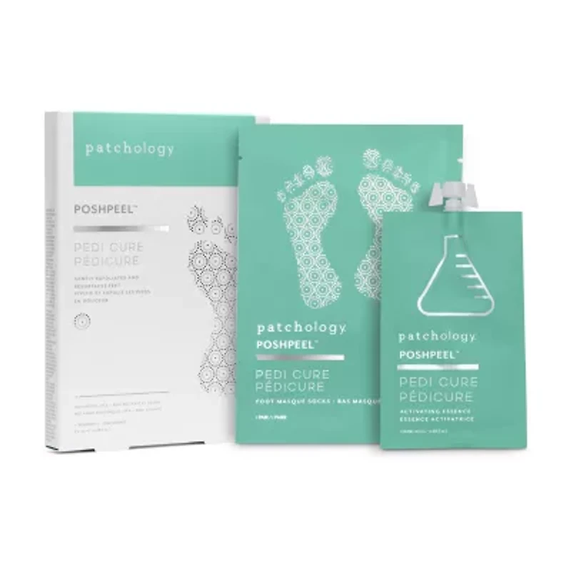 Posh peel pedi cure is a luxurious, incredibly effective foot peel treatment that progressively dissolves dead skin on your feet with a combination of powerful acids. This peel is formulated with patchology's activating essence, which contains an advanced aha plus bha botanical blend featuring glycolic, salicylic, lactic, and citric acids. These four potent ingredients work together to deeply exfoliate and soften the surface of your skin, speeding up cell turnover, and encouraging dead skin to slough off.