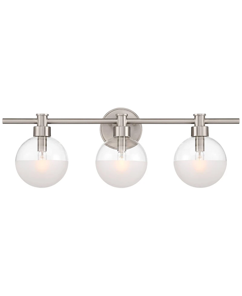 Modern minimalism blends with turn-of-the-century industrial style in the Leggio bathroom vanity light from the Possini Euro Design brand. A slender frame in brushed nickel finish adds a bright and vibrant design to your bathroom space, best served above a mirror or vanity space. Three candelabra base bulbs are housed within glass globe shades, featuring a two-tone appeal with clear and frosted glass. The Leggio vanity light is damp location rated for indoor use and can be mounted with the lights pointing up or down.