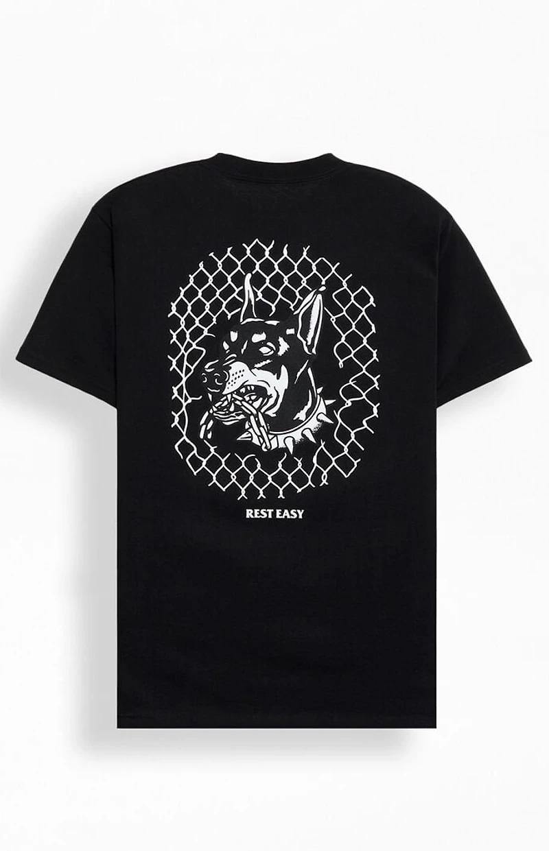 The Beware Dog T-Shirt from Rest Easy is a casual, street-ready tee with bold graphic style. It features short sleeves, a crew neckline, a Rest Easy graphic on the left chest, and a striking dog graphic on the back for standout everyday wear.