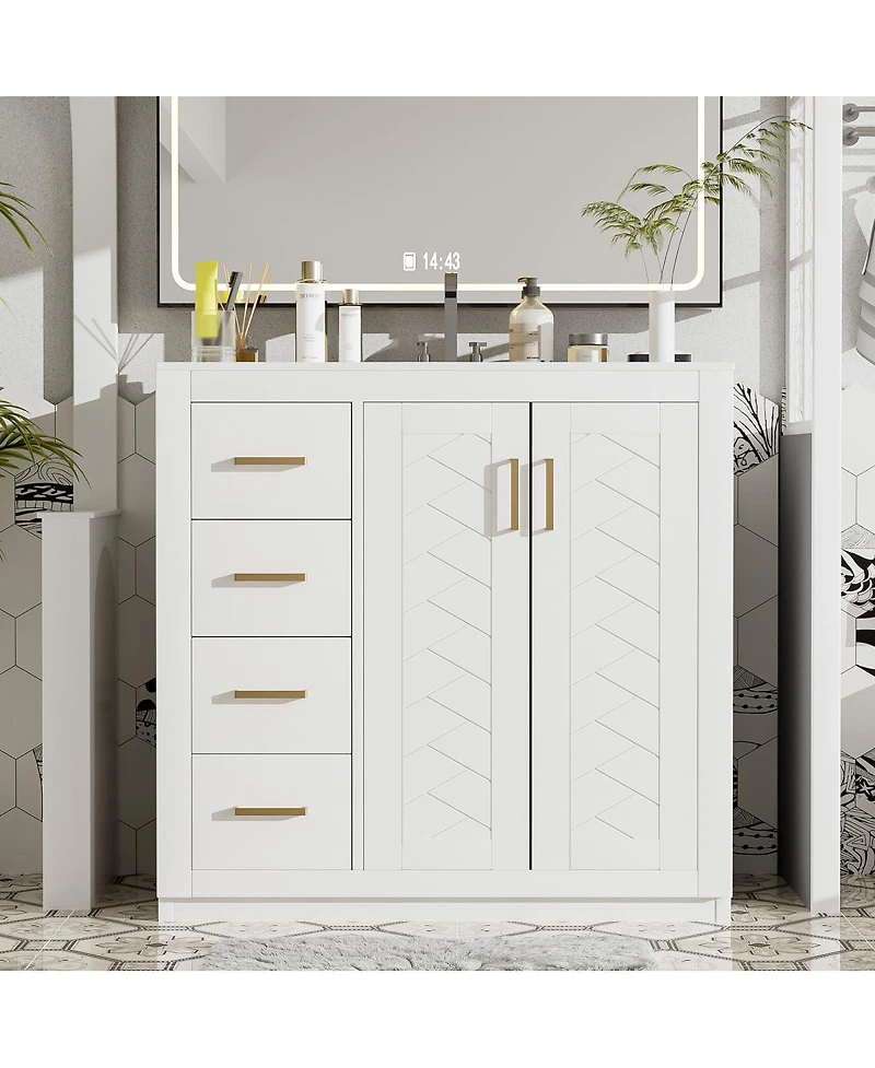 Upgrade your bathroom with this 36-inch modern vanity, designed to balance contemporary elegance with everyday convenience. The solid wood frame and high-quality Mdf panels offer remarkable durability, while the smooth ceramic sink provides a sleek, easy-to-clean surface for daily use. Soft-close drawers and doors enhance the user experience by minimizing noise and preventing slamming, ensuring a peaceful environment. This vanity features three spacious drawers and a large cabinet, giving you ample storage for toiletries, towels, and bathroom essentials. Exquisite metal handles and a unique grooved pattern detail add a refined touch, making this piece a standout addition to any bathroom decor. With its versatile design, this vanity is perfect for both modern and classic interiors. Easy assembly instructions are included, allowing you to enjoy a seamless installation and a beautifully organized space in no time.