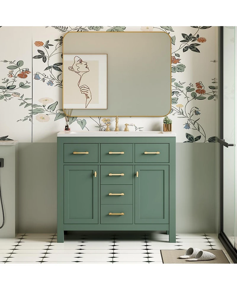 Transform your bathroom with this modern 36-inch vanity, designed to blend style and practicality. Crafted with a sturdy solid wood frame, this freestanding cabinet offers lasting durability and stability. The smooth ceramic sink is easy to maintain, adding a refined touch to your daily routine. Four spacious drawers and two soft-close doors provide ample storage for toiletries, linens, and bathroom essentials, all while keeping everything neatly organized and within reach. Elegant shaker-style detailing and exquisite hardware elevate the overall look, making it a perfect fit for both contemporary and classic spaces. The waterproof painted finish ensures reliable performance in humid environments, while high-quality hardware ensures smooth, gentle operation every time. Straightforward assembly with clearly labeled parts makes installation simple, allowing you to enjoy your beautiful new centerpiece in no time.