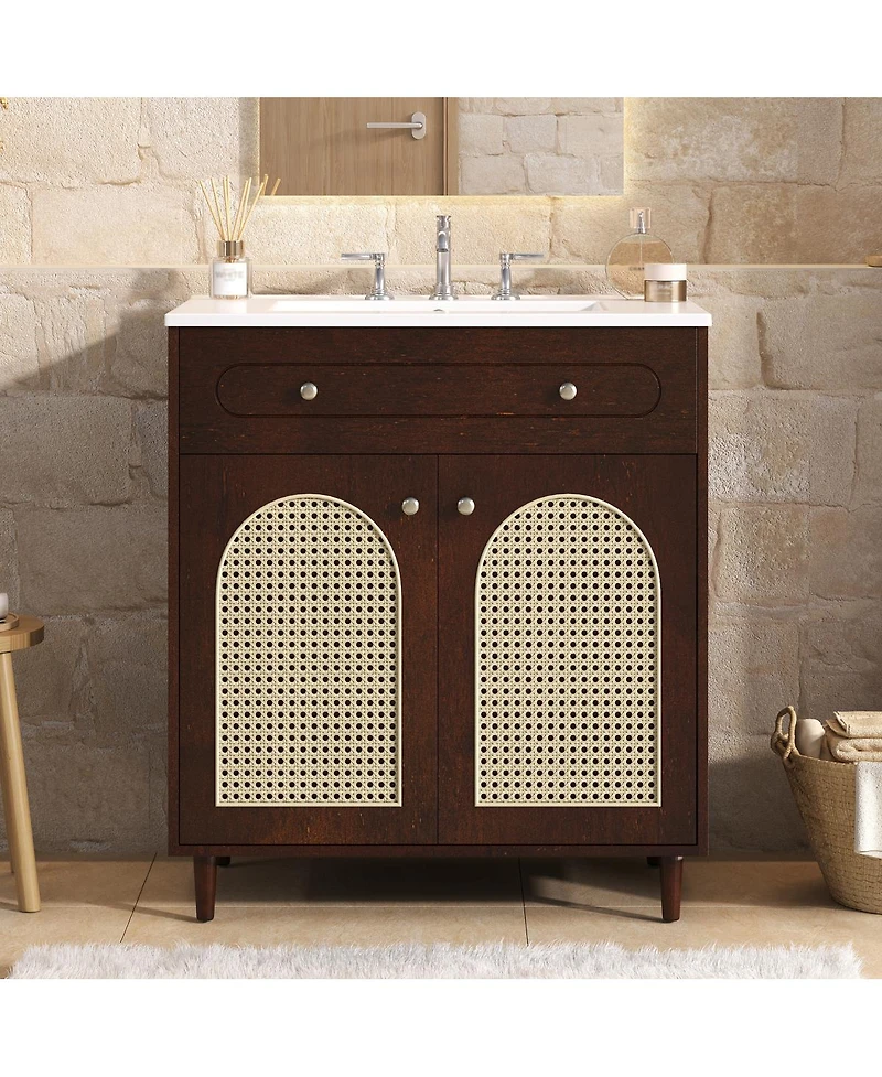 Transform your bathroom with this contemporary vanity, expertly crafted for both elegance and performance. The spacious ceramic sink is stain-resistant and easy to maintain, while the solid wood and Mdf cabinet frame promises long-lasting stability. A practical tip-out drawer keeps small essentials within reach, and a fully adjustable shelf offers flexibility for towels, bottles, or cleaning supplies. The soft-close doors guarantee a gentle, quiet touch every time. The woven rattan panel adds natural texture, blending artisan detail with modern minimalism. Streamlined metal handles and ample storage make this vanity a stylish and functional addition, perfect for your next bathroom upgrade.